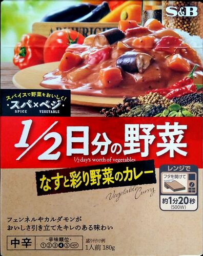 今日のレトルトカレーはS&B「1/2日分の野菜 なすと彩り野菜のカレー」です。 1/2日分の野菜を摂れるいうことで体に良さそうなカレーです。 ■商品情報(パッケージより)■ ・野菜175gを使用(1日の野菜摂取量の目安350g)・フェンネルやカルダモンがお…