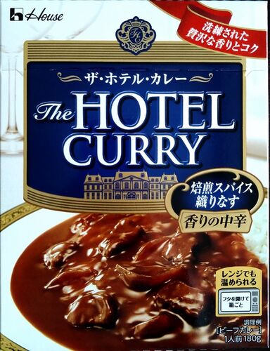 今日のレトルトカレーはハウス「ザ・ホテル・カレー」焙煎スパイス織りなす香りの中辛です。 ■商品情報(パッケージより)■ ・洗練された贅沢な香りとコク・焙煎スパイス織りなす香りの中辛・辛さレベルは4(5段階中)・カロリーは1食(180g)当たり222kc…