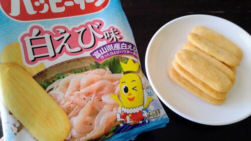 夫が出張土産に買ってきてくれた「ハッピーターン 白えび味」を食べてみました。 富山県産の白えびから作った白えびパウダーを使用。 白えび味のターン王子はどんなのかな。 手に白エビのせてウインクしているターン王子でした。 さっそく袋から出してみます…