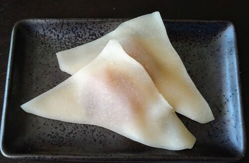 今日のおやつはさくら味の生八ツ橋です。 10個入りで680円。催事で購入しました。 袋から出すとニッキの香りがします。 切ってみると中には、刻んだ桜葉塩漬けが入ったさくら餡が見えます。 それではいただきます! おいしい〜! 桜葉塩漬けの塩味がいい感じ…