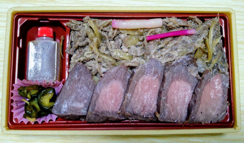 焼肉との組み合わせや、サーロインステーキのみの弁当もありましたが、サーロインステーキとすき焼きの組み合わせの弁当にしました。