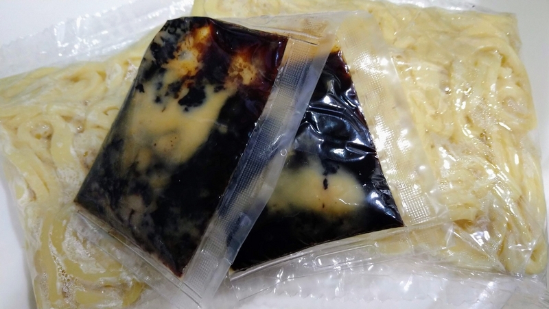 太い中華麺と、ラード入りのこってりソースが入ってます。