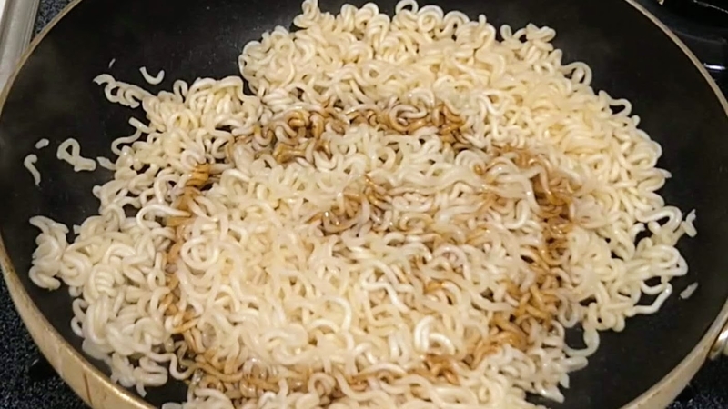 ・麺がほぐれ、水気がなくなったら火を止め液体ソースを入れます。